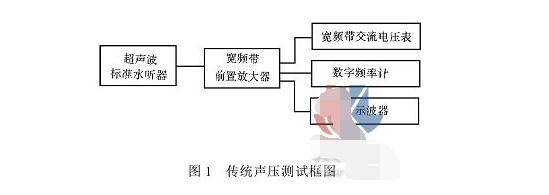 標(biāo)準(zhǔn)水聽器經(jīng)過校準(zhǔn),它能將作用在它上面的聲壓轉(zhuǎn)換成相同頻率及波形的交流電壓信號,此電壓信號與聲壓的強(qiáng)度成正比。當(dāng)將該水聽器插入受超聲波作用的液體介質(zhì)中時(shí),它就有一電壓信號輸出。經(jīng)前置放大器不失真放大后,送入交流電壓表。數(shù)字頻率計(jì)同時(shí)測得超聲波的頻率,示波器可隨時(shí)監(jiān)視信號電壓波形的變化。這一測量方法已被普遍采用了。